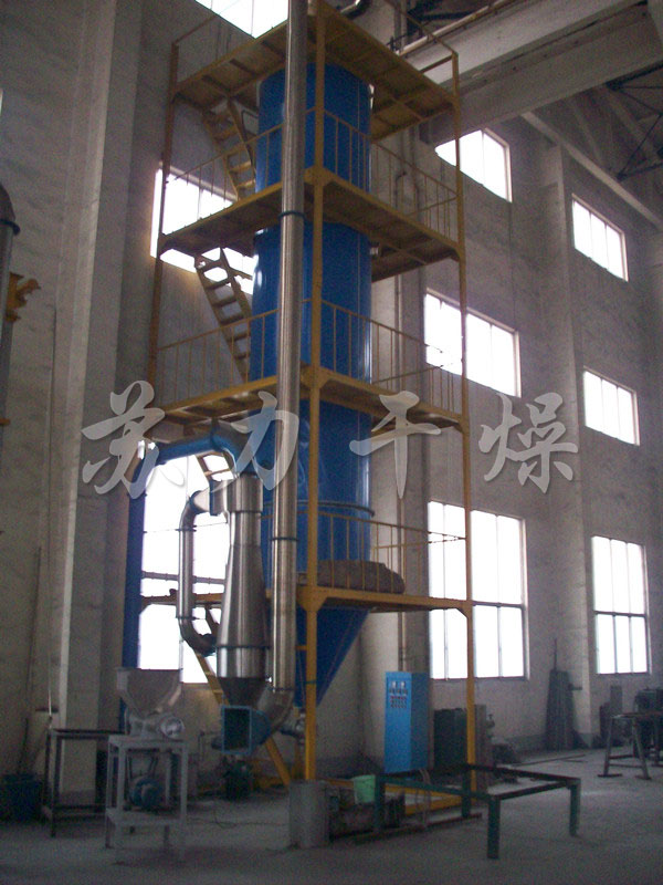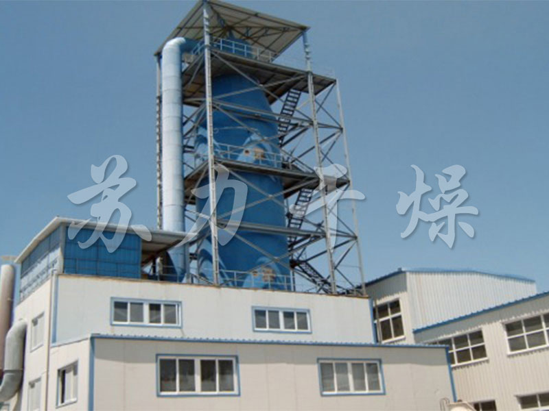壓力噴霧干燥機(jī)工作過程為:料液通過隔膜泵高壓輸入,噴出霧狀液滴,然后同熱空氣并流下降,大部分粉粒由塔底排料口收集,廢氣及其微小粉末經(jīng)旋風(fēng)分離器分離,廢氣由抽風(fēng)機(jī)排出,粉末由設(shè)在旋風(fēng)分離器下的收粉筒收集,風(fēng)機(jī)出口處還可裝備二級(jí)除塵裝置,回收率在96%-98%。